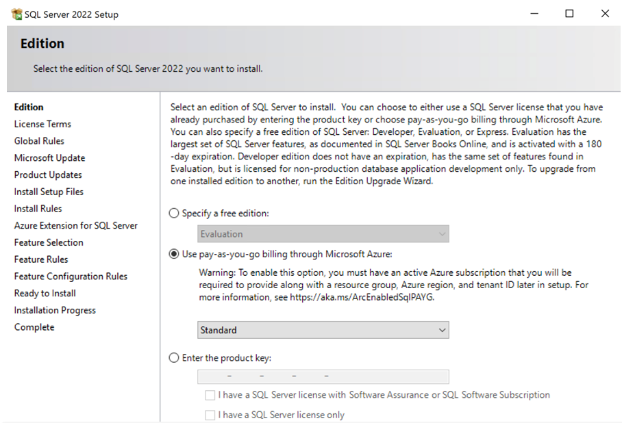 Mevcutta yer alan sunucunuzu SQL Arc ile lisanslamak yerine sıfırdan bir kurulum yapıyorsanız bu lisans avantajını SQL server kurulum adımında da seçebilirsiniz. Bu adım için SQL server Evalution ISO dosyasını Microsoft üzerinden ücretsiz bir şekilde download ederek kurulum adımında lisanslama yapabilirsiniz.