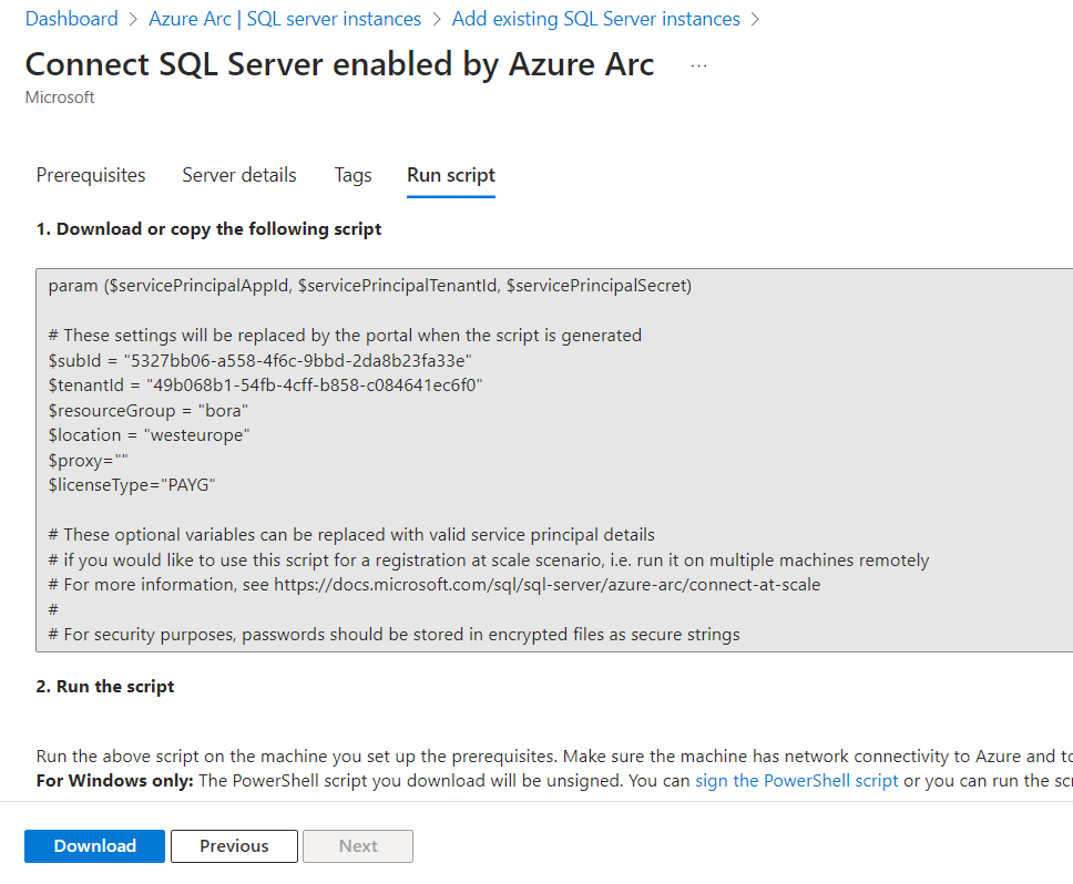 bir sonraki adımda yer lana Tags bölümünü geçtikten sonra son menü olarak karşımıza çalıştırmamız gereken bir Powershell script’i gelecek. Bu script’i  download ederek ya da kopyalarayak lisanslayacağımız SQL server üzerinde çalıştırıyoruz.
