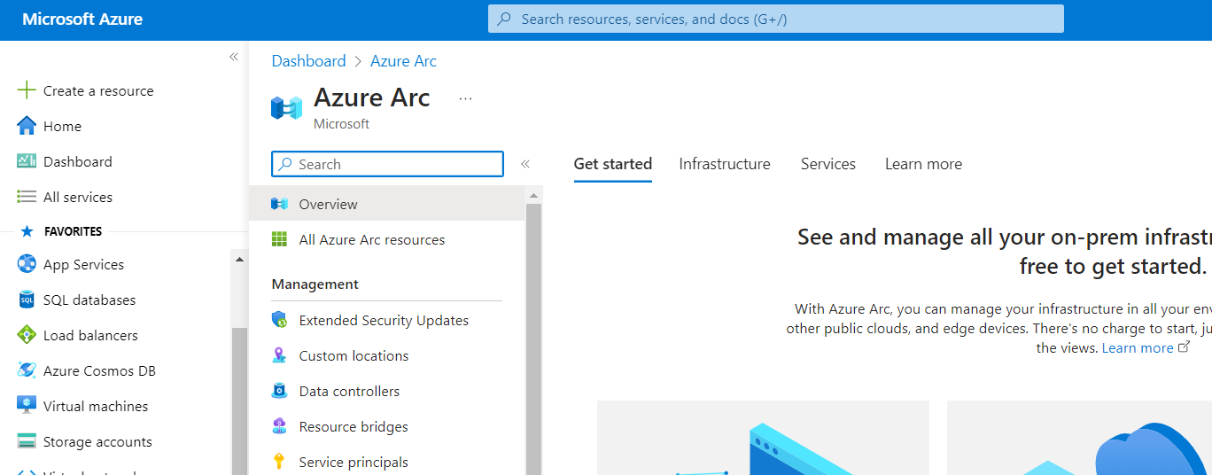 İlk aşamada Arc servisinin kurulumu için bir Azure aboneliğine ihtiyacımız bulunuyor. Mevcutta bir Azure aboneliğiniz varsa portal.azure.com üzerinden giriş yaparak üst menüden Arc servisine erişebilirsiniz.