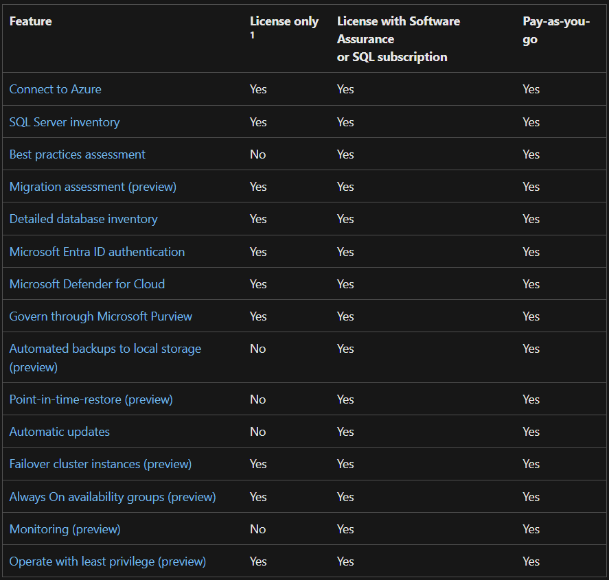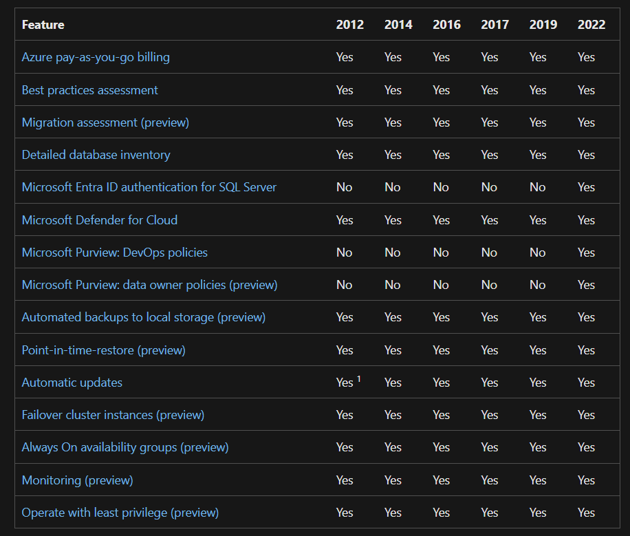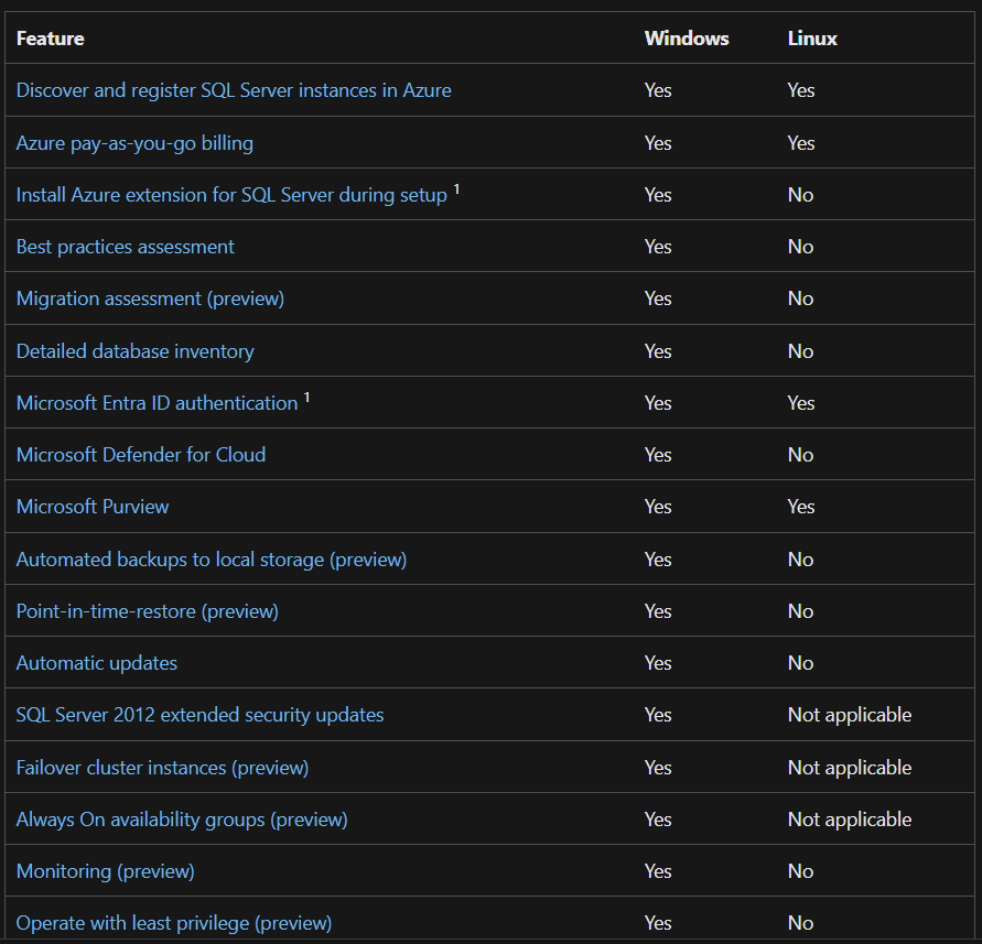 İşletim sistemlerine göre sql arc for azure özellikleri