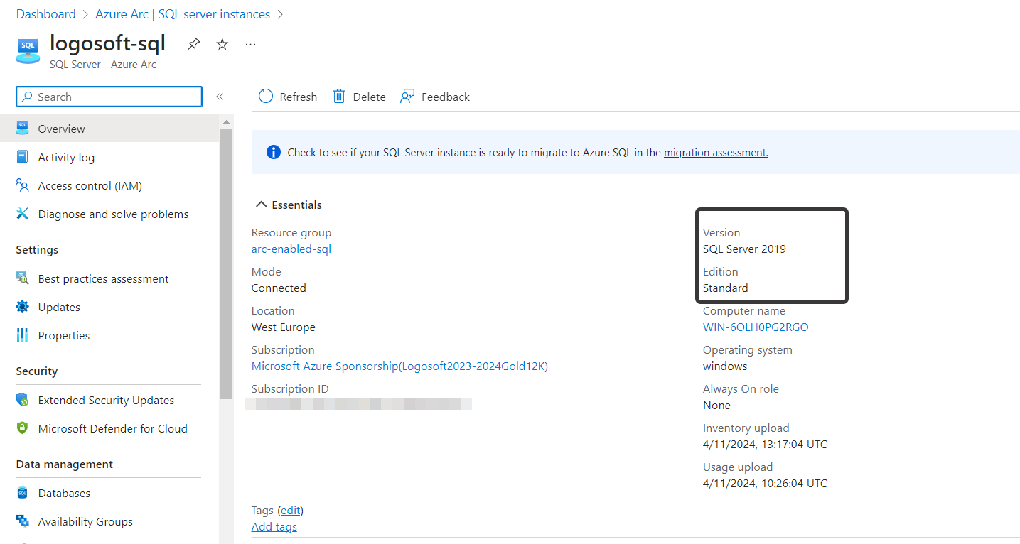 İşlemlemlerimiz bu adımda sona eriyor, powershell scripti çalıştırdıktan 15 dakika sonra Onprem ya da farklı bir sağlaycıda yer alan SQL sunucumuzu Azure ARC servisi altında görebilirsiniz. Sağ üst kısımda SQL versiyon ve edition detaylarınız yer alanacaktır.
