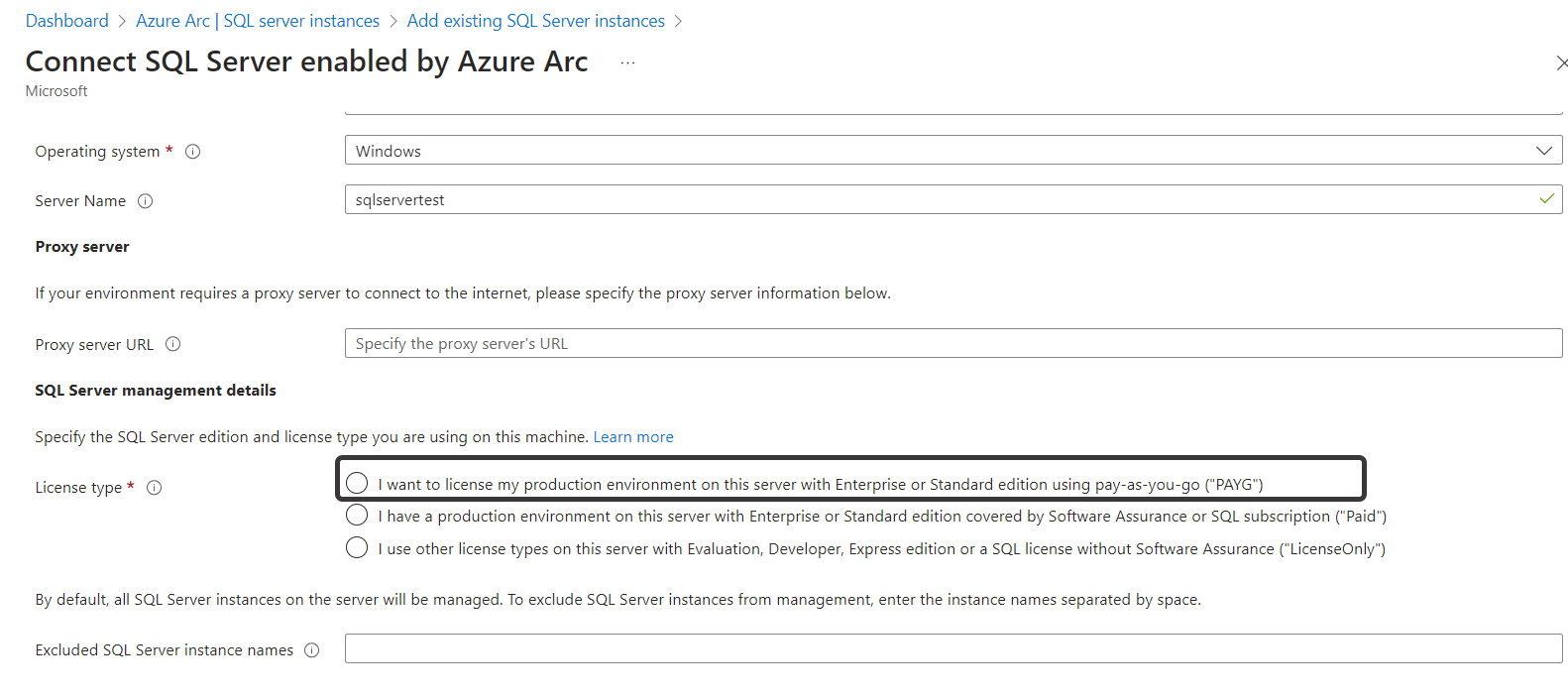 Eğer bir proxy kullanmıyorsanız alt kısımda yer alan Proxy server seçeneğini boş bırakabilirsiniz. Bu bölümde en önemli seçenek lisans tipiniz. Eğer SQL Standart ya da Enterprise bir lisansı PAYG yani kiralama modeline göre aylık olarak satın almak istiyorsanız ilk seçeneği seçerek devam edebilirsiniz. Sahip olduğunuz bir lisans var ve ARC üzerinden lisanslama haricinde yönetmek istiyorsanız aşağıdaki seçenekleri tercih edebilirsiniz. Son olarak lisanslamak istemediğiniz SQL server isimleri varsa bunu Excluded SQL server list bölümüne ekleyebiliriz.